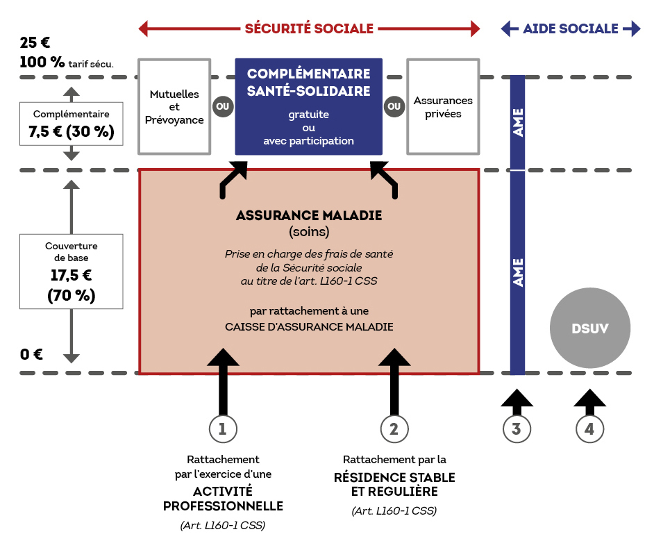 L’Assurance maladie obligatoire (avec une assurance maladie complémentaire facultative), voir les développements et les sources dans l’article en ligne Assurance maladie. Il s’agit de la protection de droit commun accessible à toute personne installée en France (ce qui exclut les personnes de passage, même en cas d’urgence médico‑chirurgicale), et pour les étrangers, accessible seulement à ceux résidant avec un droit au séjour légal. L’ouverture des droits à l’assurance maladie est accordée, soit du fait de l’exercice d’une activité professionnelle autorisée, dès la première heure travaillée (repère ① du schéma), soit du fait de la simple présence en France avec ou sans cotisation en fonction des ressources (repère ②). Depuis la réforme dite PUMa (Protection universelle maladie de 2015), le statut d’« ayants droit » ne concerne plus que les mineurs à la charge d’un assuré (non figuré sur le schéma). La durée d’ouverture des droits ne peut être inférieure à six mois, même lorsque le titre de séjour est de plus courte durée. Il n’y a pas de rétroactivité de la date d’ouverture des droits (et donc pas de remboursement des soins effectués avant la date de la demande) sauf si une demande de Complémentaire‑santé‑solidaire a été faite simultanément. L’ouverture du droit à l’assurance maladie est matérialisée par la délivrance d’une notification papier, puis d’une carte vitale sous réserve de l’obtention d’une identification (ex-immatriculation) définitive.
